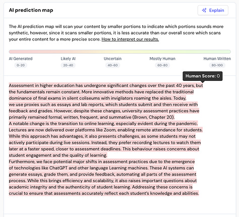 There are further sources of evidence. Winston AI, an AI detector, is very clear that the foreword is written by AI. On various sections it indicates a 0% chance of human authorship; it is very unusual for the detector to be so certain of AI authorship: